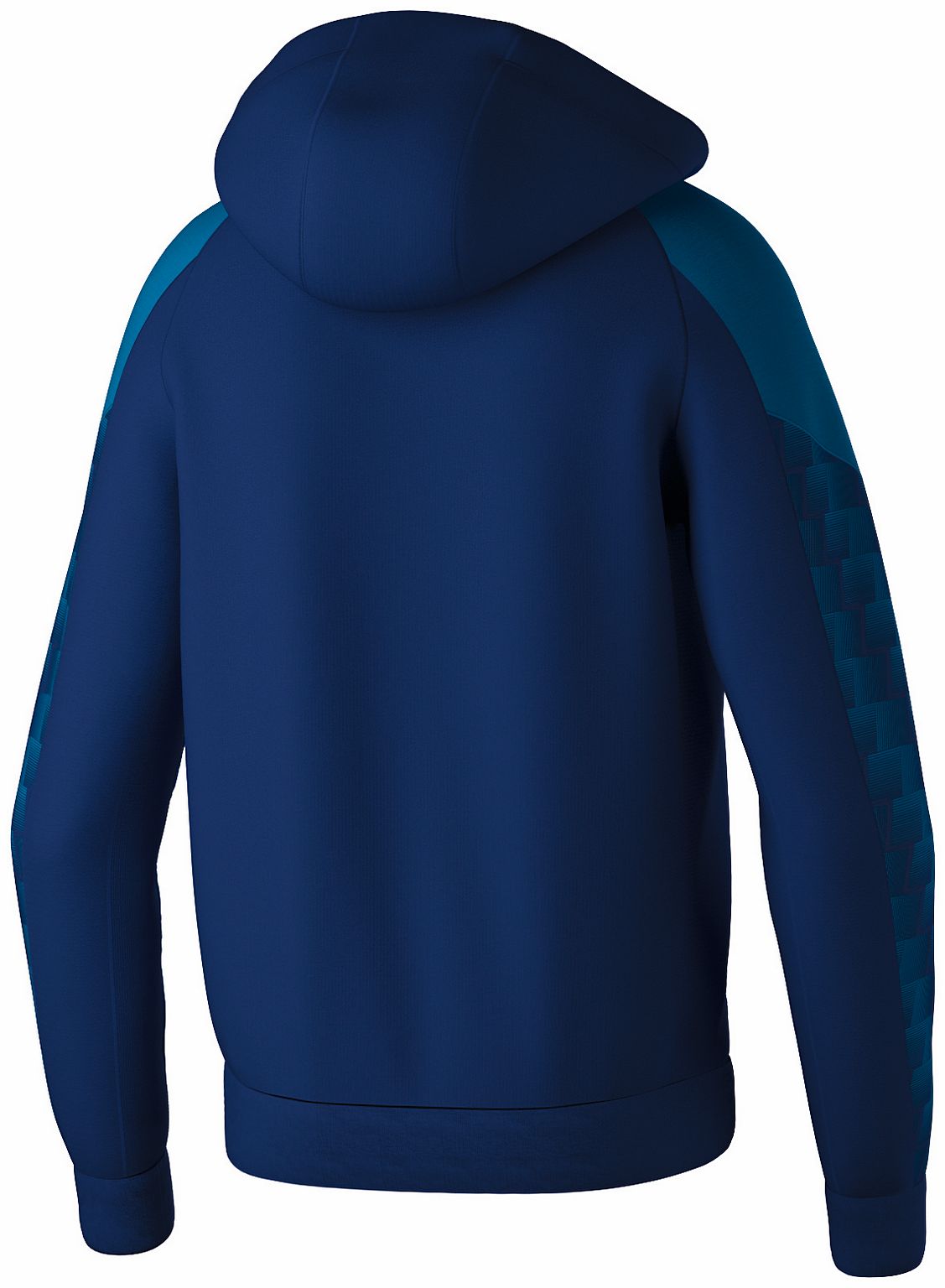 Erima Teamline EVO STAR TRÆNINGSJAKKE MED HÆTTE. Slidstærk hættetrøje med høj bærekomfort, slidstærkt funktionelt materiale, raglan-stil og strækindsatser for fuld bevægelsesfrihed, høj krave med hætte og snor, bred ribkant på ærmer og forneden, skjulte lynlåslommer i siderne, stilfuldt design på ærmerne med 3D-effekt, kontrastfarvet piping på ærmerne. Materiale: 100% genanvendt polyester