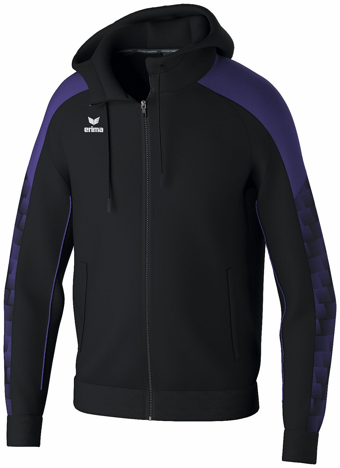 Erima Teamline EVO STAR TRÆNINGSJAKKE MED HÆTTE. Slidstærk hættetrøje med høj bærekomfort, slidstærkt funktionelt materiale, raglan-stil og strækindsatser for fuld bevægelsesfrihed, høj krave med hætte og snor, bred ribkant på ærmer og forneden, skjulte lynlåslommer i siderne, stilfuldt design på ærmerne med 3D-effekt, kontrastfarvet piping på ærmerne. Materiale: 100% genanvendt polyester