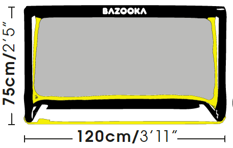 Det vejer kun 5 kg, er nemt at transportere og kan både bæres over skulderen eller klappes sammen på få sekunder. BazookaGoal er ekstremt slidstærkt, fremstillet i polycarbonat, PVC og nylonkompositter, og fungerer perfekt på både kunstgræs, græs, i haven, hallen, på gaden eller stranden.
